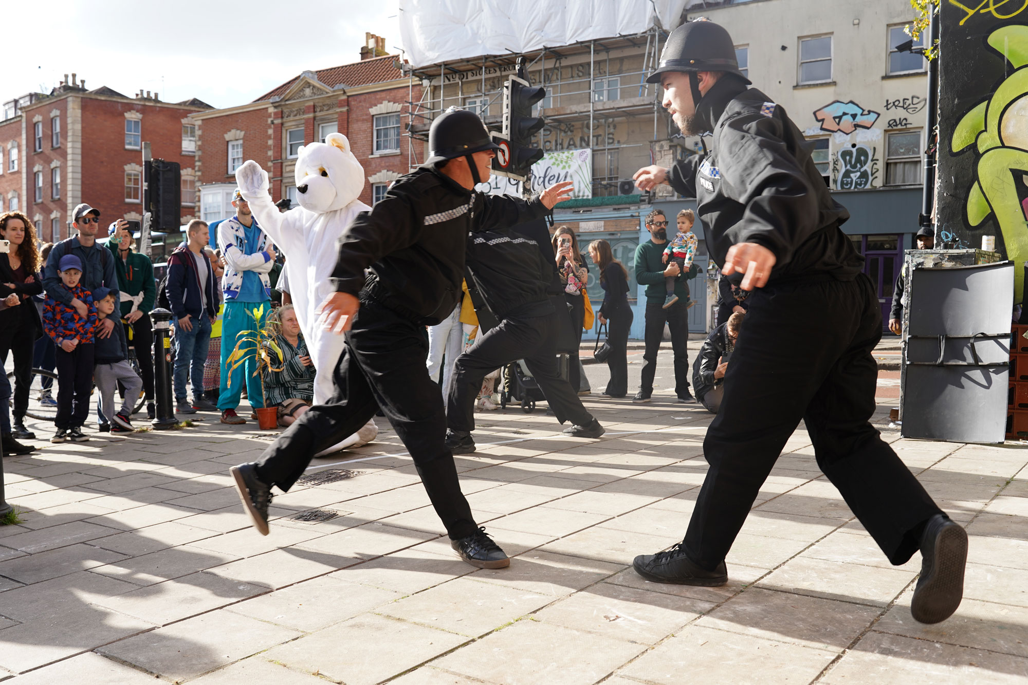 Here, you’ll also have a chance encounter escapees from Banksy’s Mild Mild West Graffiti mural up the road, as riot police dance with a teddy bear brandishing a molotov cocktail!
