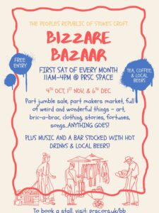 PRSC’s Bizarre Bazaar is joined by markets at both Kit Form and Elemental… there will be beautiful goods crafted by local makers, hot drinks of all descriptions, artwork, and some bizarre jumble bits to boot! It’s going to be very cosy and very yummy. See y’all there ![]()